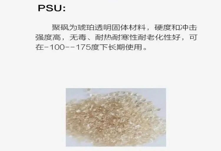 PSU(Polysulfone聚砜)为琥珀透明固体材料,密度1.25-1.35 g/cm³。