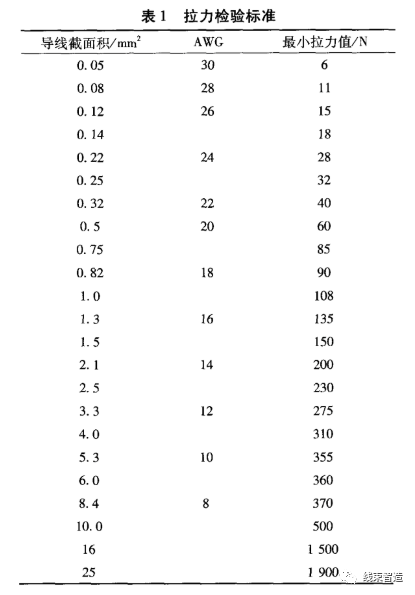 线束端子压接最普遍、直观的质量检验方式是拉力检查。对不同电线截面积与不同规格接线端子压接后的拉力检验标准如表1所示。