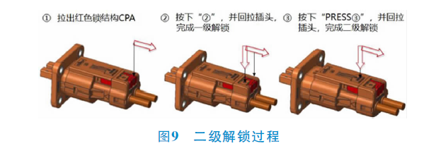 二次解锁分为两种方式,一种是通过操作顺序来实现,通过与正常拔出的反方向或不同方向来实现,如市场上主流的HVA800、HVC800系列高压连接器产品,连接器拔出时,助力板手与分离方向正好相反或不在一个方向上,以增加拔出时的响应时间,达到二次解锁功能。另一种为机械式的二次解锁功能,当拔出连接器时,第一次只能拔出到高压互锁端子断开的位置,这个状态下功率端子仍然有效接触,此时高压回路因高压互锁端子分离而断开,然后再经过二次操作才能把功率端子分离,从而实现两次解锁功能要求,机械式二次解锁与操作顺序解锁相比,具有更高的安全性,但结构相对更复杂。图9为二级解锁过程。