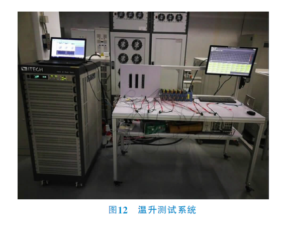 为有效对高压连接器进行测试,试验室搭建了用于温升测试的系统(图12),测试系统包括直流恒流源、数据采集系统以及控制单元。直流恒流源为被测样品提供所需电流值,数据采集系统采集被测样件各个点的温度值及环境温度,控制单元用于调整整个测试系统中的电流值。
