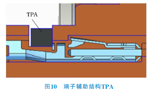 连接器端子保持辅助结构(TerminalPositionAssurance,简称TPA)(图10),是用于对端子的二次保护和限位的一种结构,防止端子在外界拉力的作用下脱出,造成线路中断,应用在环境比较恶劣或要求拉脱力更大的情况下。这种构成中一般会包含两种保持结构,一是端子本身的保持结构,另一种是由TPA构成的保持结构。