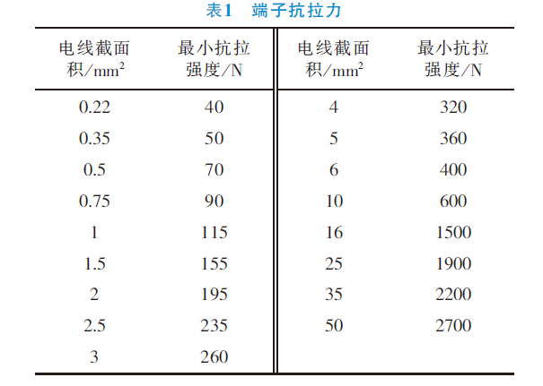1)端子抗拉力。评估端子压接的效果包含端子与线之间的压接最小抗拉强度。主要参数要求见表1。