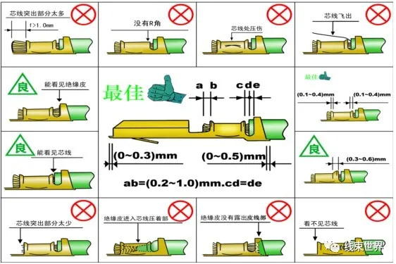 3、导体与端子相接部位、单线与单线之间无明显缝隙;5、端子压接卷曲部分端部不能触到端子内壁,距离端子底部应不小于单丝直径的1/2;6、端子无明显毛刺,毛刺高度(e)应不超过压接后壁厚,毛刺宽度(f)应不超过端子压接后壁厚的1/2;