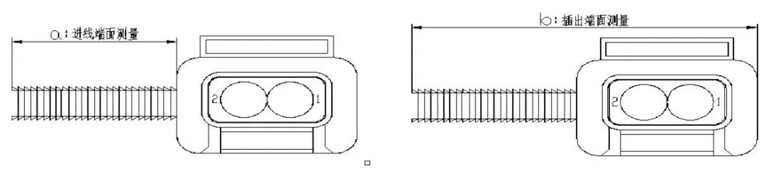 不同主机厂的线束图纸、特殊线束产品(如高压线)对分支测量点定义不同,如图1 所示:a、要求从插接器进线端的端面测量,b、要求从插接器插出端的端面测量。两种测量方式给相同长度,插接器的尺寸是否包含在分支内将会导致
