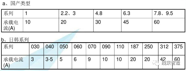 ⑩不同规格的插接件可承载的电流一般如下:(仅供参考)
