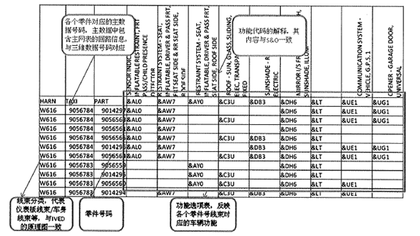 结合回路表中每个回路对应的选项定 义及线束零件矩阵中的功能选择定义,IVED系统可以依据逻辑语言判断出特定回路是否存在于特定零件号的零件中。