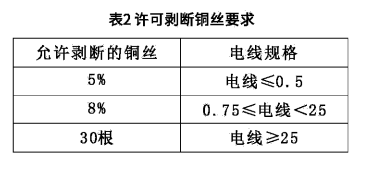 导线作为电路连接的主要载体,其在端子压接部位会首先通过剥皮的方式将铜丝外露,导线在剥皮过程中,往往会导致铜丝损伤,不同规格的导线其可剥断的铜丝根数满足表2要求,根据导体面积计算的导体许可的剥断铜丝数须舍去小数点后面的数值取整。