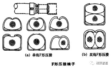 在F形压接中,冷冲压连接后,端子绝缘压接区不允许出现端子刺伤导线线芯的情况,单线F形压接如下图a所示,双线F形压接如下图b所示。