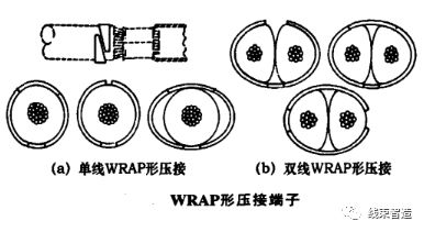 端子冷冲压连接后,不允许出现端子刺伤导线绝缘层的情况,压接后绝缘压接区中两外侧面必须处于一对平行的平面内,单线WRAP形压接如下图a所示,双线WRAP形压接如下图b所示。