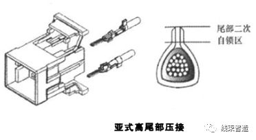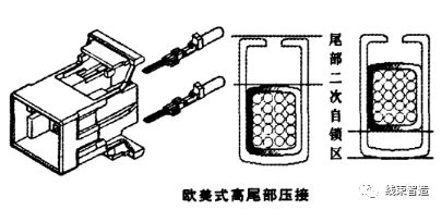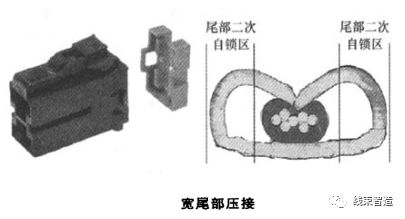通常带有二次尾部自锁的护套,所配备的端子在应用时端子尾部必须做特殊压接处理,常用的有高尾部、宽尾部压接,即绝缘压接区的压接高度或宽度需在一个数值段内才能满足自锁要求,否则尾部二次自锁可能会失效,导致品质降低,隐患增多。端子的尾部压接形状由护套本身决定,一般情况下,非标准特殊尾部压接有以下三种压接类型。