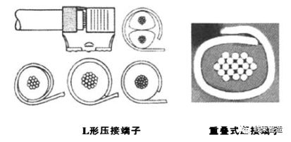 此压接方式使用在旗型端子的压接中,通常很少使用,下面左图为L形单、双线压接示意。此压接类型在中华骏捷控制台线束中与手制动开关对接的端子座进行了使用。