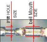 (对比端子宽喇叭口部位宽较端子宽更宽) 2)线芯部长度在1.5mm以内的端子FEDDING时向动时因空间小喇叭口形象准确校正几乎不可能 | 1)喇叭口的说明 →线皮部同线芯压接部之间使电线柔和的压接根部的扩张区间 2)喇叭口的作用 →电流通过时,为释放产生的热量 →为防止压接部损伤 →为防止线芯压接部根部(校角)压力过大对线芯保护及提高耐久性 |