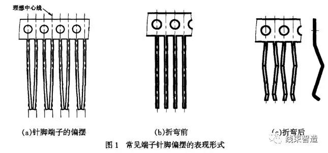 在折弯前已经偏摆的端子针脚由于折弯时的折弯线并不垂直其实际中心线,而是垂直于理想中心线,针脚折弯之后同样会发生如图1(c)所示的变形。