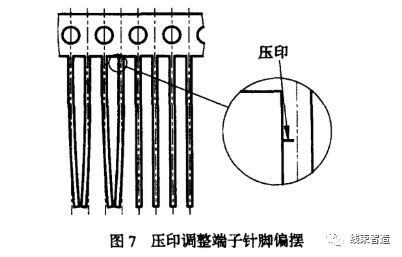 在端子针脚根部实施压印将端子针脚调直,这种方式主要用于由冲裁造成的端子针脚偏摆,如图7所示。