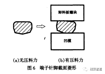 对于压料力不足引起的针脚偏摆,卸料板可以适当加大0.01-0.05mm的压下量,压下量的选取应当综合考虑卸料板已有的预压量、材料厚度和性能等因素,防止过度强压使端子针脚变形。
