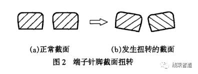 (1)压料不稳容易在冲裁时使端子针脚截面发生倾斜或扭转(见图2)。这种情况下端子针脚一般不会在冲裁后立即发生偏摆,而是在折弯时,由于截面的扭转,端子针脚实际折弯线与端子针脚中心线不垂直而发生偏摆。