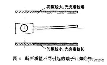 这种原因引起的偏摆可以通过端子针脚的断面质量(如光亮带或圆角的大小不同)来判断,如图4所示。一般情况下,针脚偏斜的方向是冲裁间隙较小的一侧。