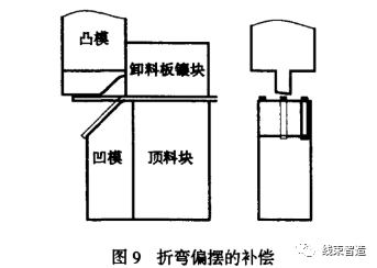 对于折弯后产生S型偏摆的端子针脚,可在成形凸模上加工斜面使得向一侧偏摆的端子针脚在折弯过程中向另一侧偏移和扭转,达到补偿偏摆的目的,如图9所示。