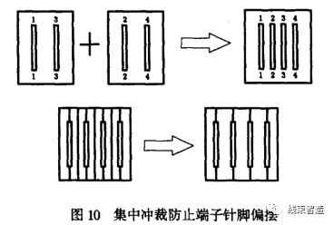 这样可以方便布置凸模和保证凹模强度,但会使后一步的一侧端子冲裁时压料面过小,造成压料不稳现象,进而引起端子针脚偏摆。