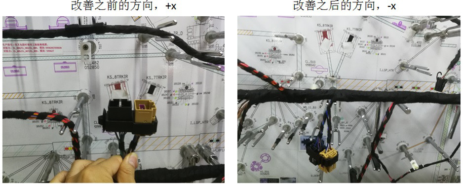 上面的图片很形象生动的标明了汽车线束装配的立体坐标,所有分支和零件都要遵循这个方向规范去装配,对装配工作有很强的实际指导意义, 下面让我们来看看实际的案例