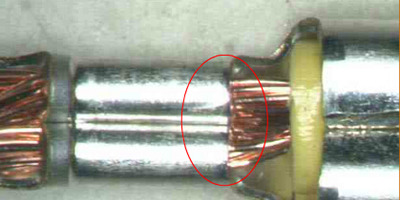 不良的原因:压接手势不正确或挡板调试不当导致芯线压接部位压进外皮,造成外皮压接过度不良。